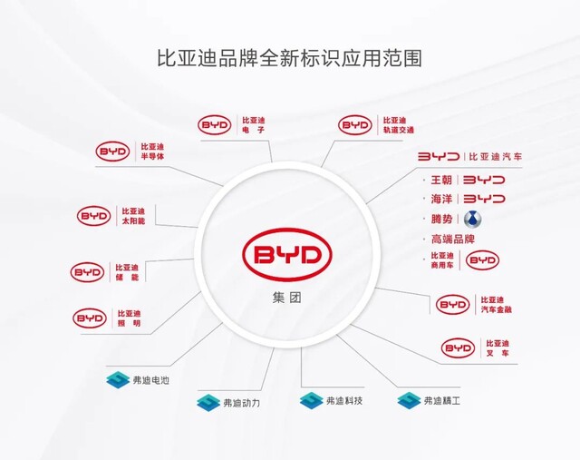 比亞迪集團新標識,將在旗下電子、新能源、軌道交通以及汽車產業中使用,與此同時,汽車產業的乘用車板塊各品牌將使用各自的品牌標識。